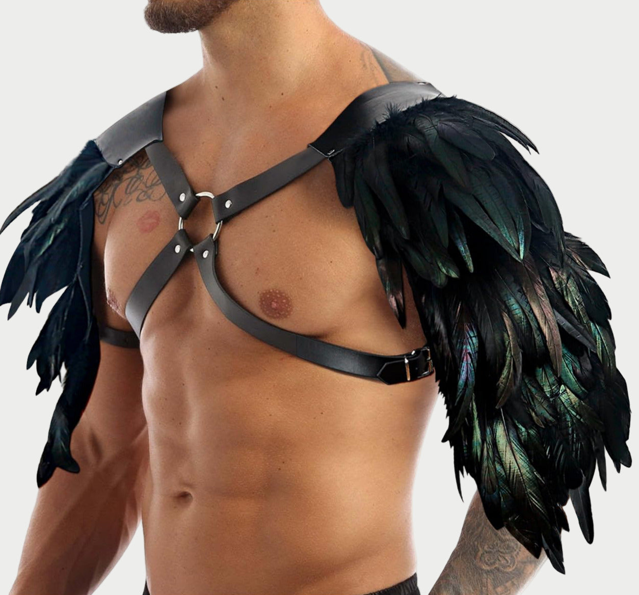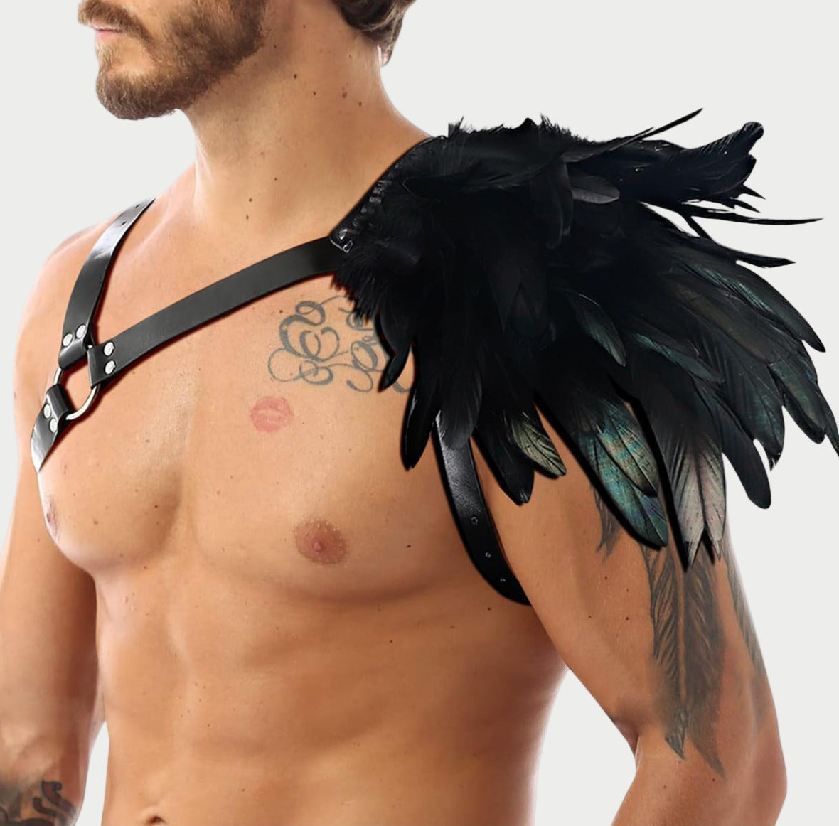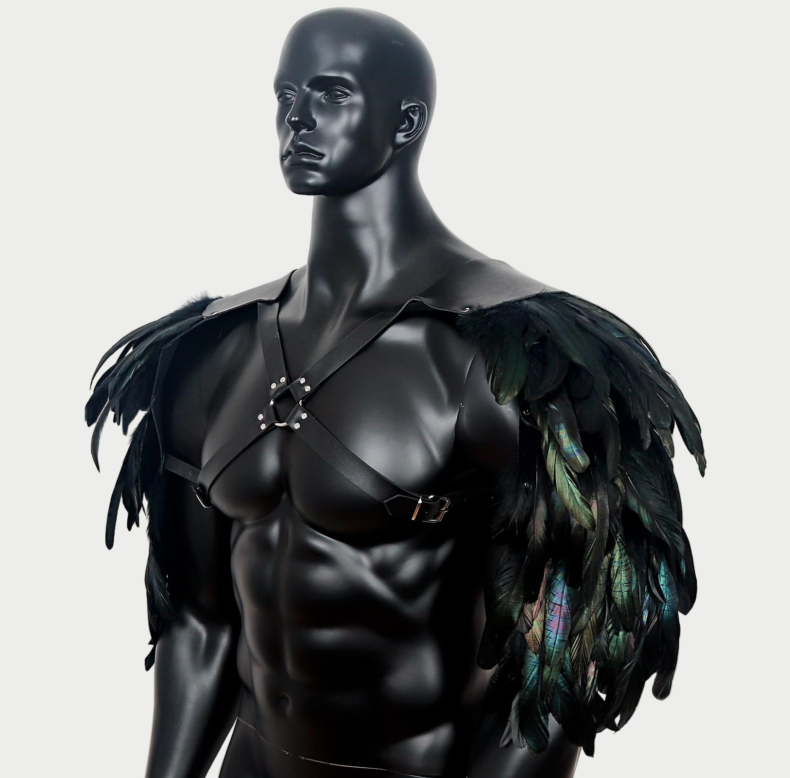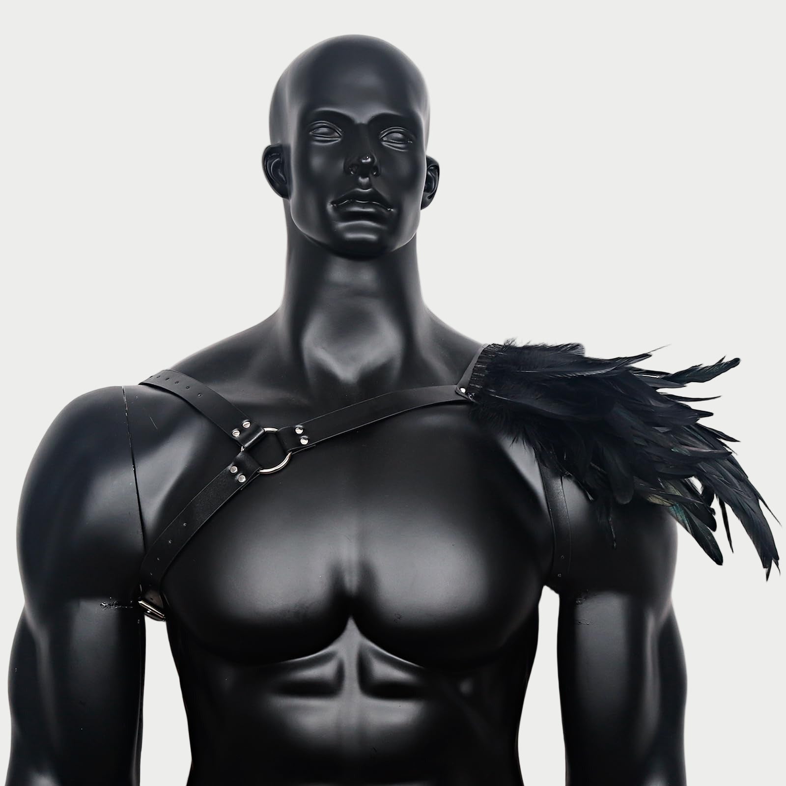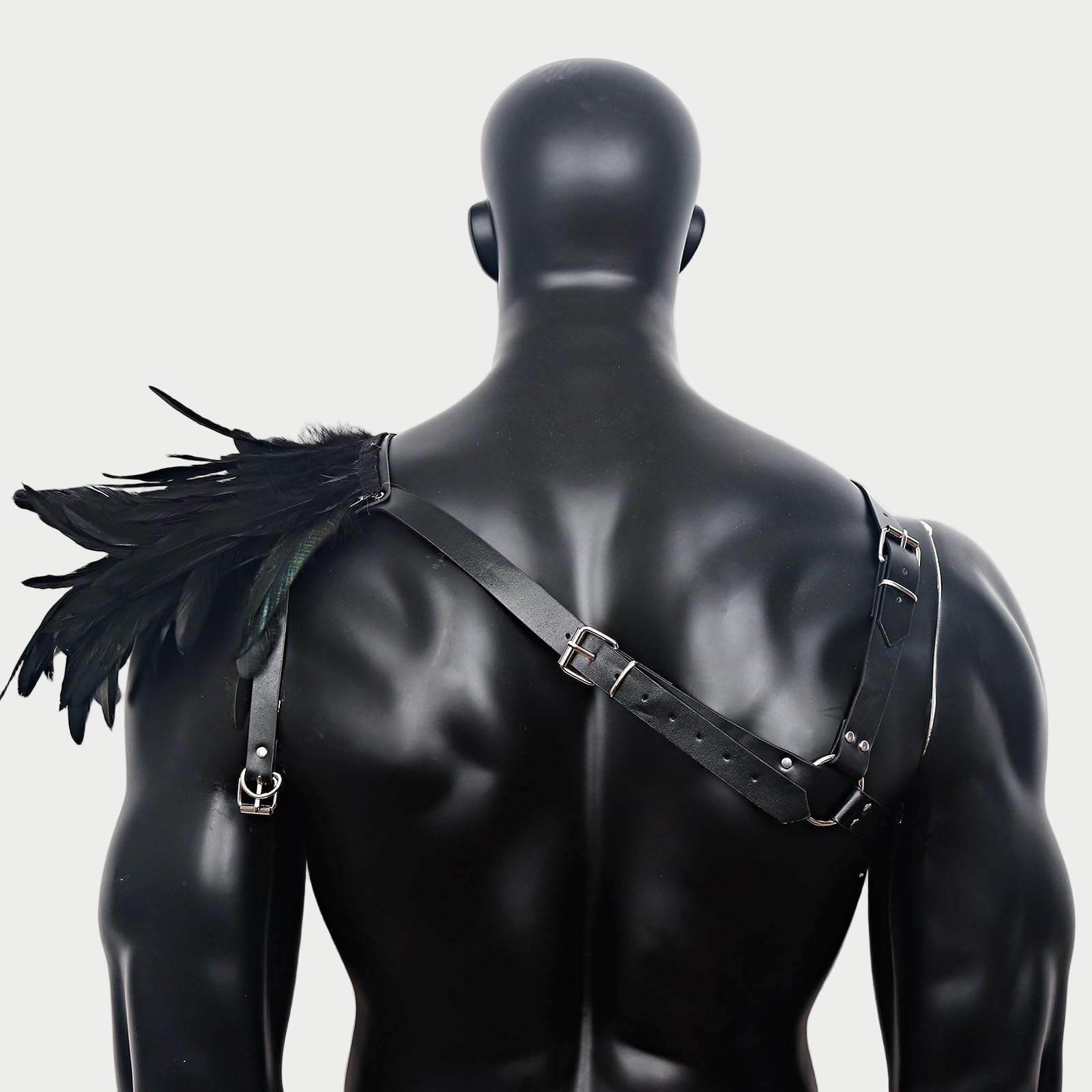 Command the night in this striking shoulder harness, blending sleek faux leather with dark iridescent feathers for a look that’s equal parts celestial and sinful.