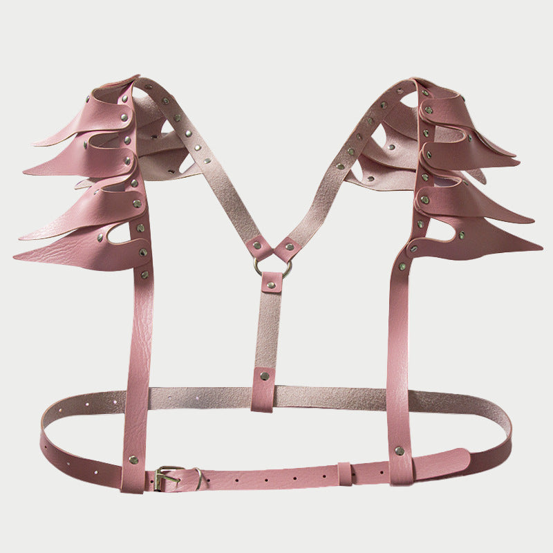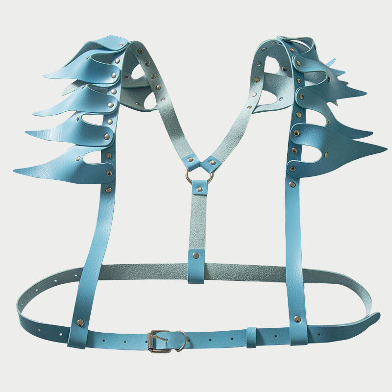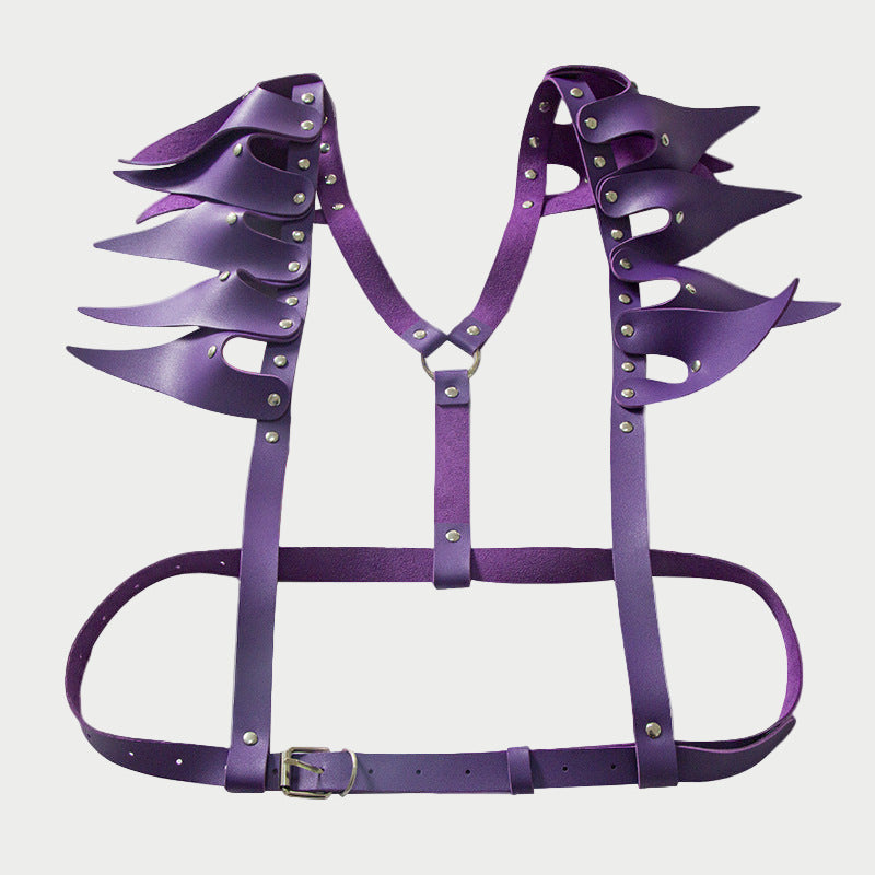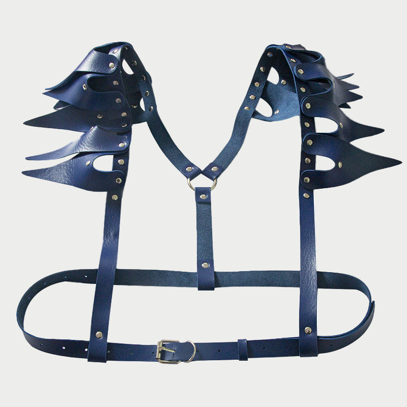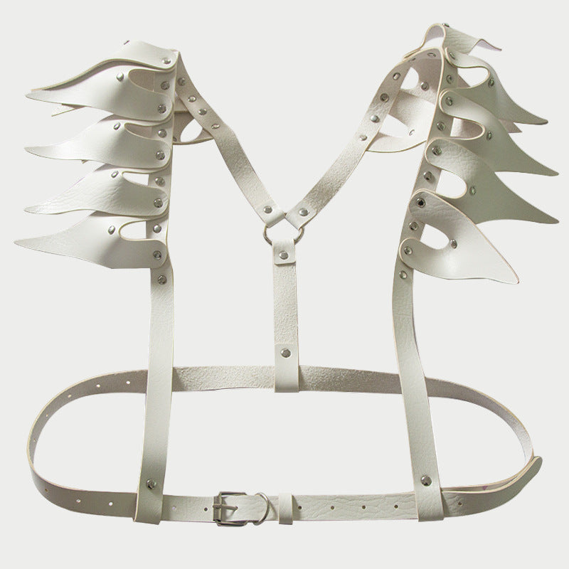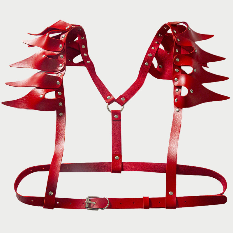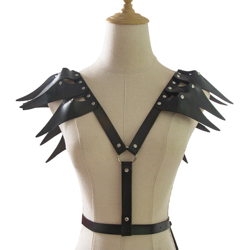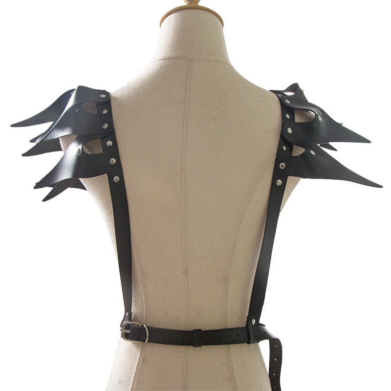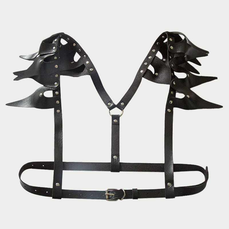 Command attention with this dramatic faux leather harness featuring jagged, wing-like shoulder accents.