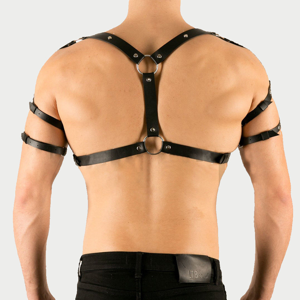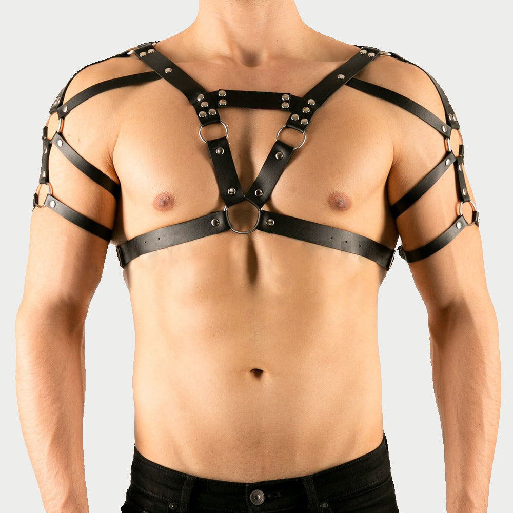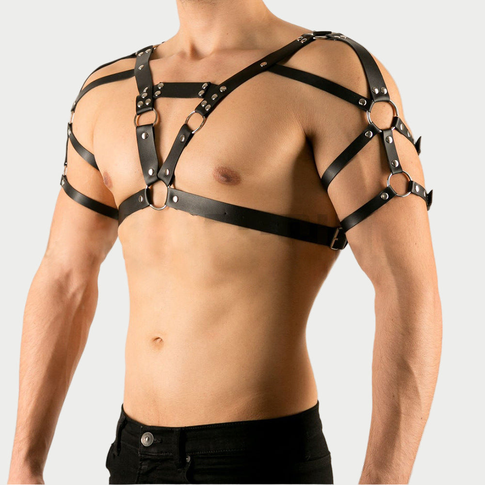 This multi-strap faux leather harness is built for bold impact, featuring a web of adjustable straps and metal O-rings that frame the chest and shoulders.