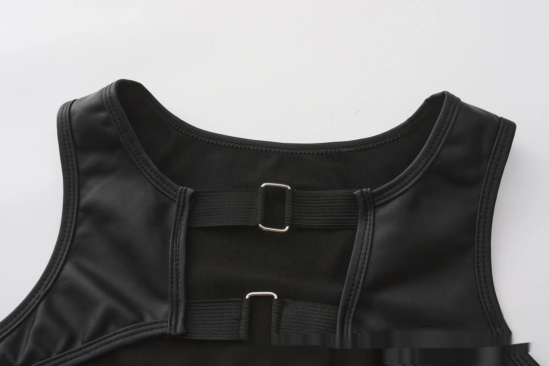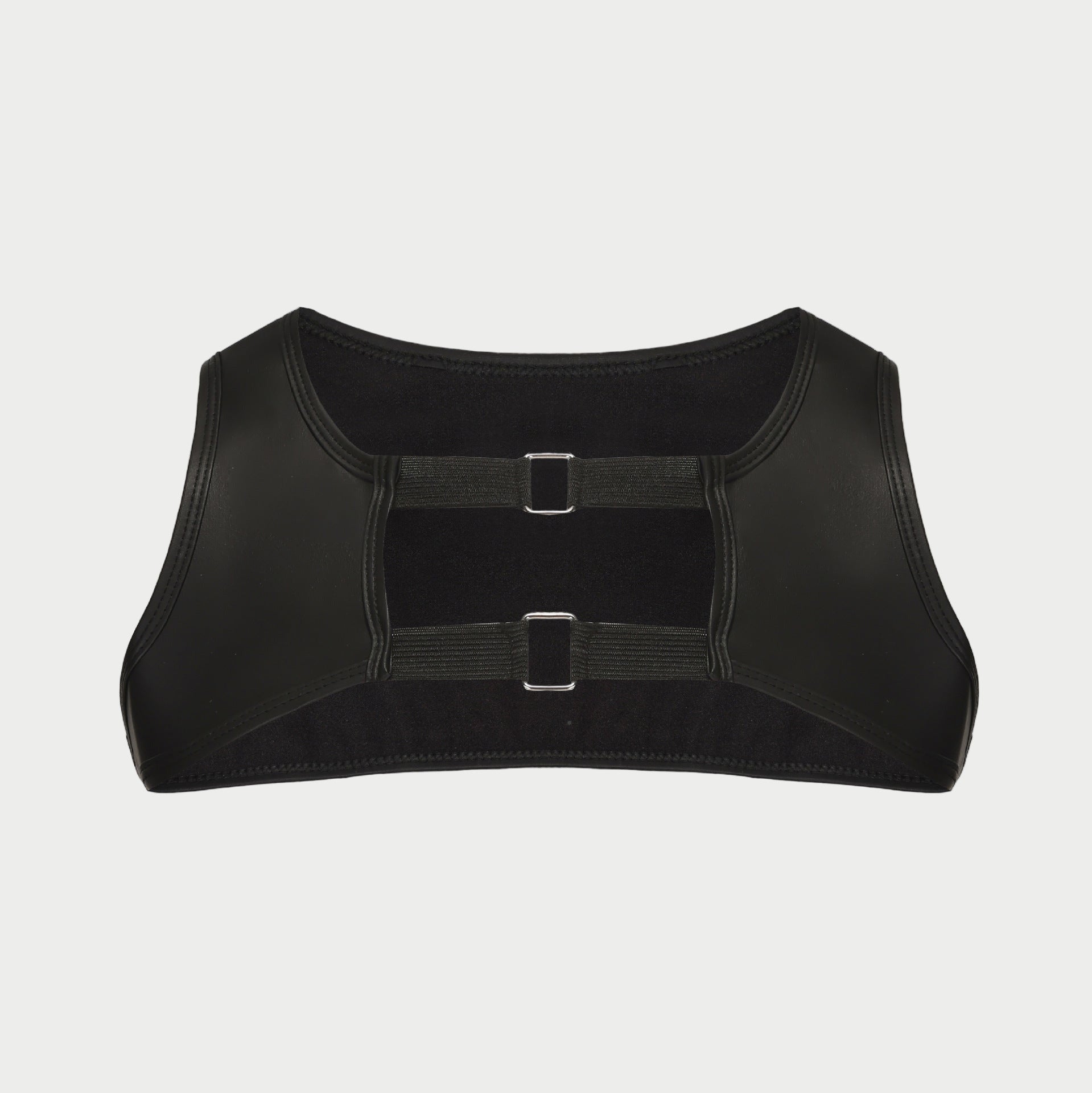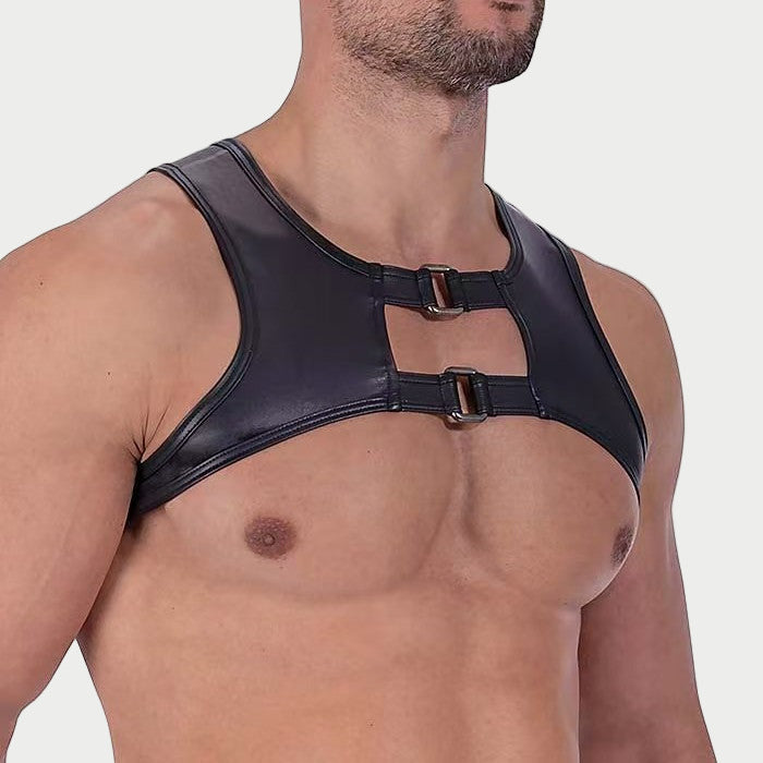 Bold and structured, this sleek leather-look harness features a double buckle design across the chest for a distinctive and dominant aesthetic.