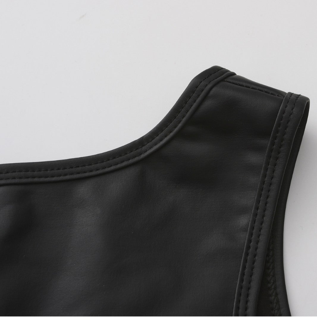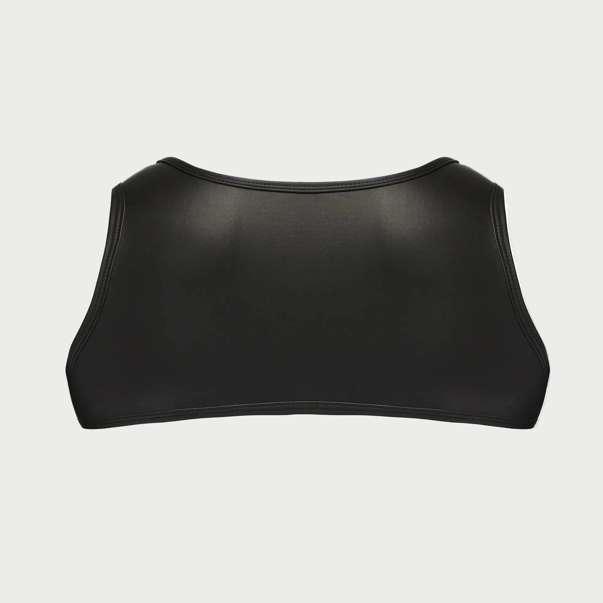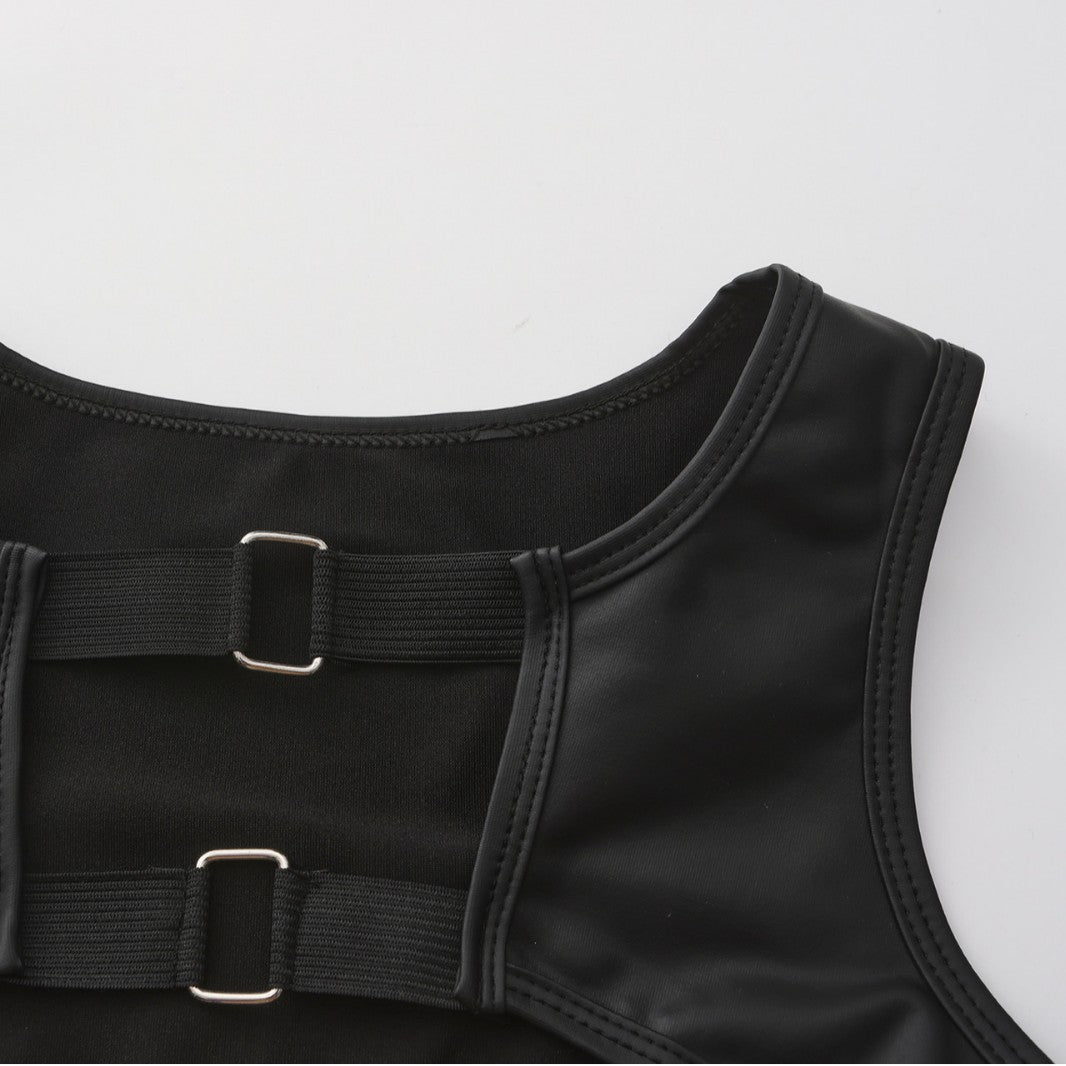 Bold and structured, this sleek leather-look harness features a double buckle design across the chest for a distinctive and dominant aesthetic.