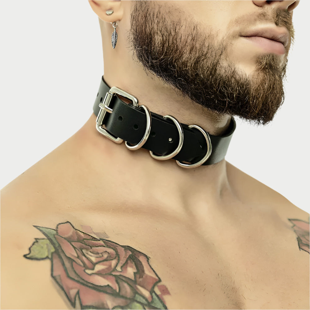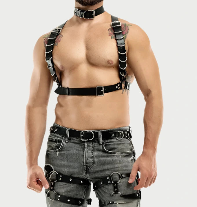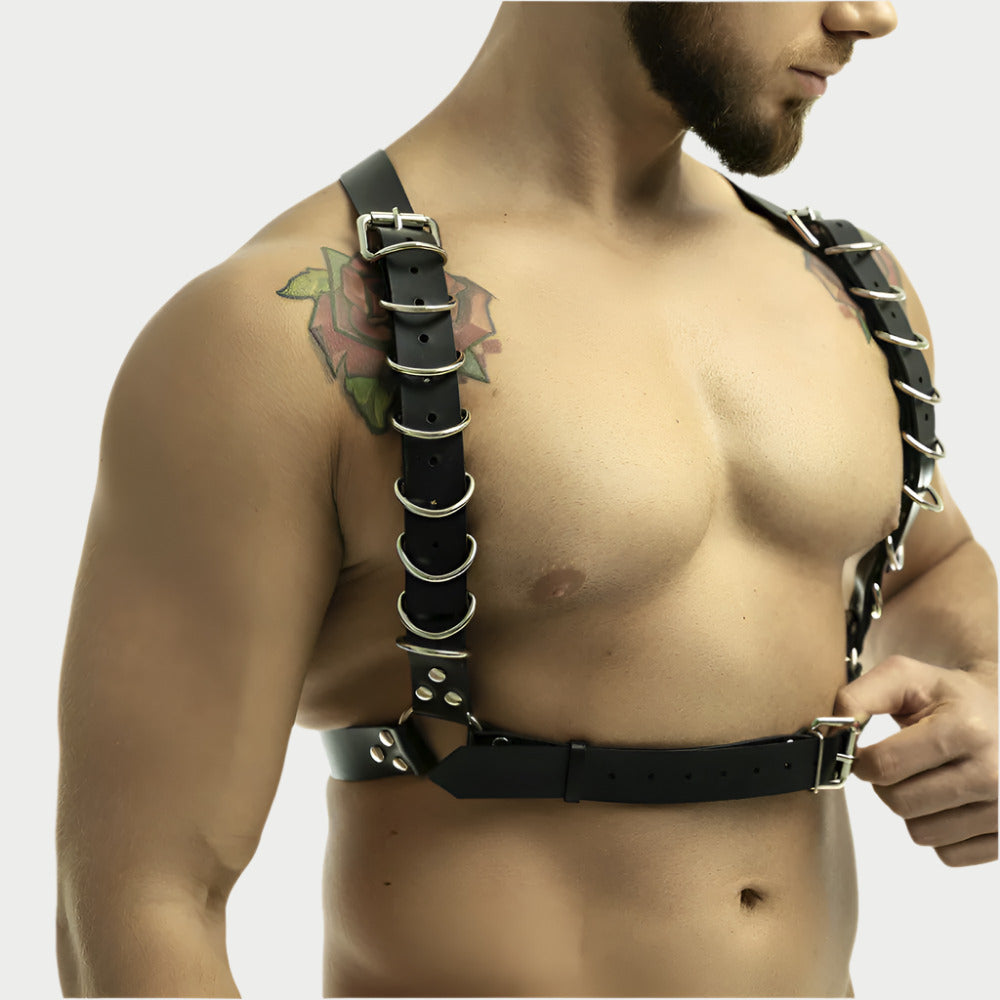 A bold, edgy design featuring multiple adjustable straps, buckles, and metal rings from neck to waist. Crafted for maximum visual impact and fetish appeal.